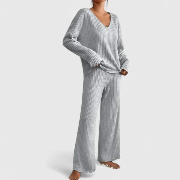 Elevate your at-home wardrobe with Annie's cozy knitted lounge set, featuring a soft V-neck sweater and wide-leg pants with a subtle ribbed texture. Designed for comfort and elegance, it’s perfect for slow mornings, work-from-home days, or casual errands in style.