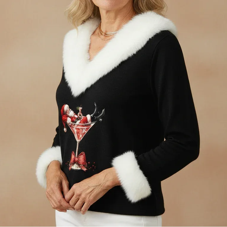 This Christmas sweater blends playful seasonal charm with all-day comfort. The flattering neckline and soft feel make it perfect for parties, gatherings, or cozy evenings. Designed to bring joy and style together, it offers a polished yet relaxed look you’ll love throughout the season.